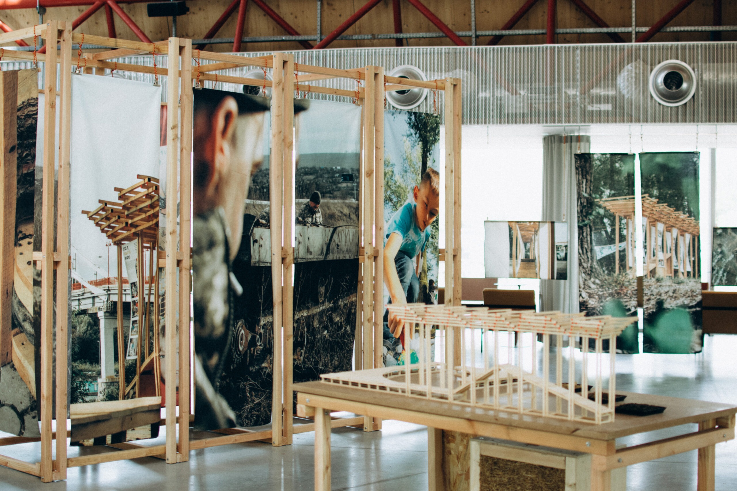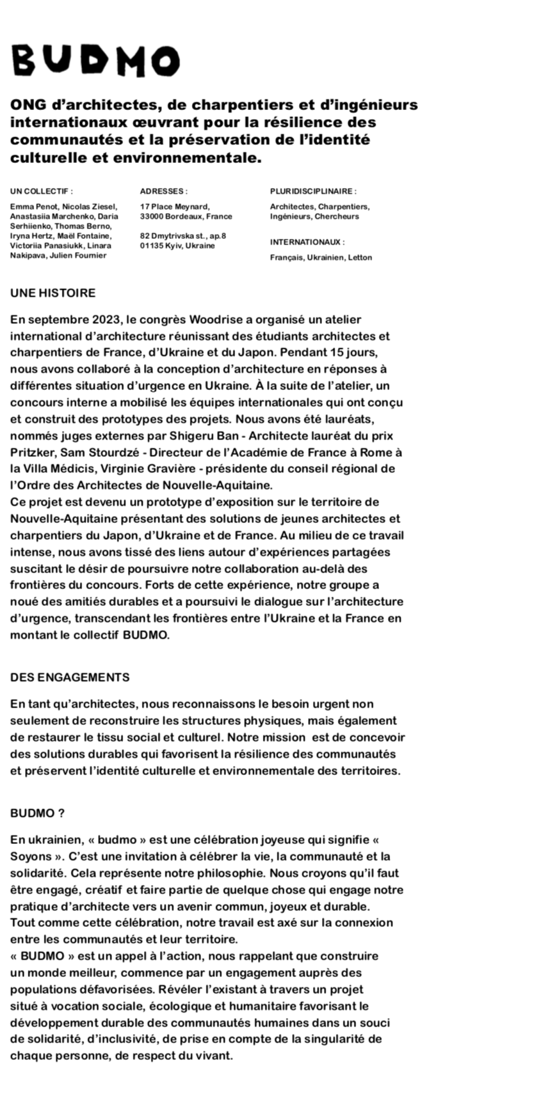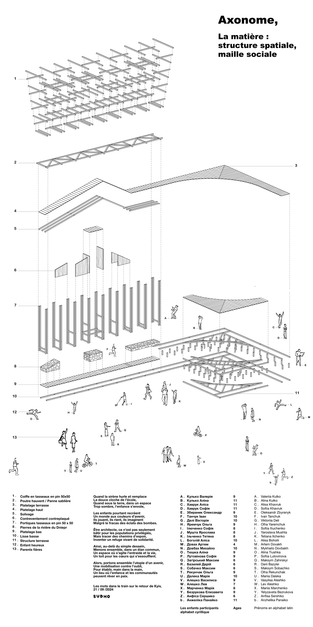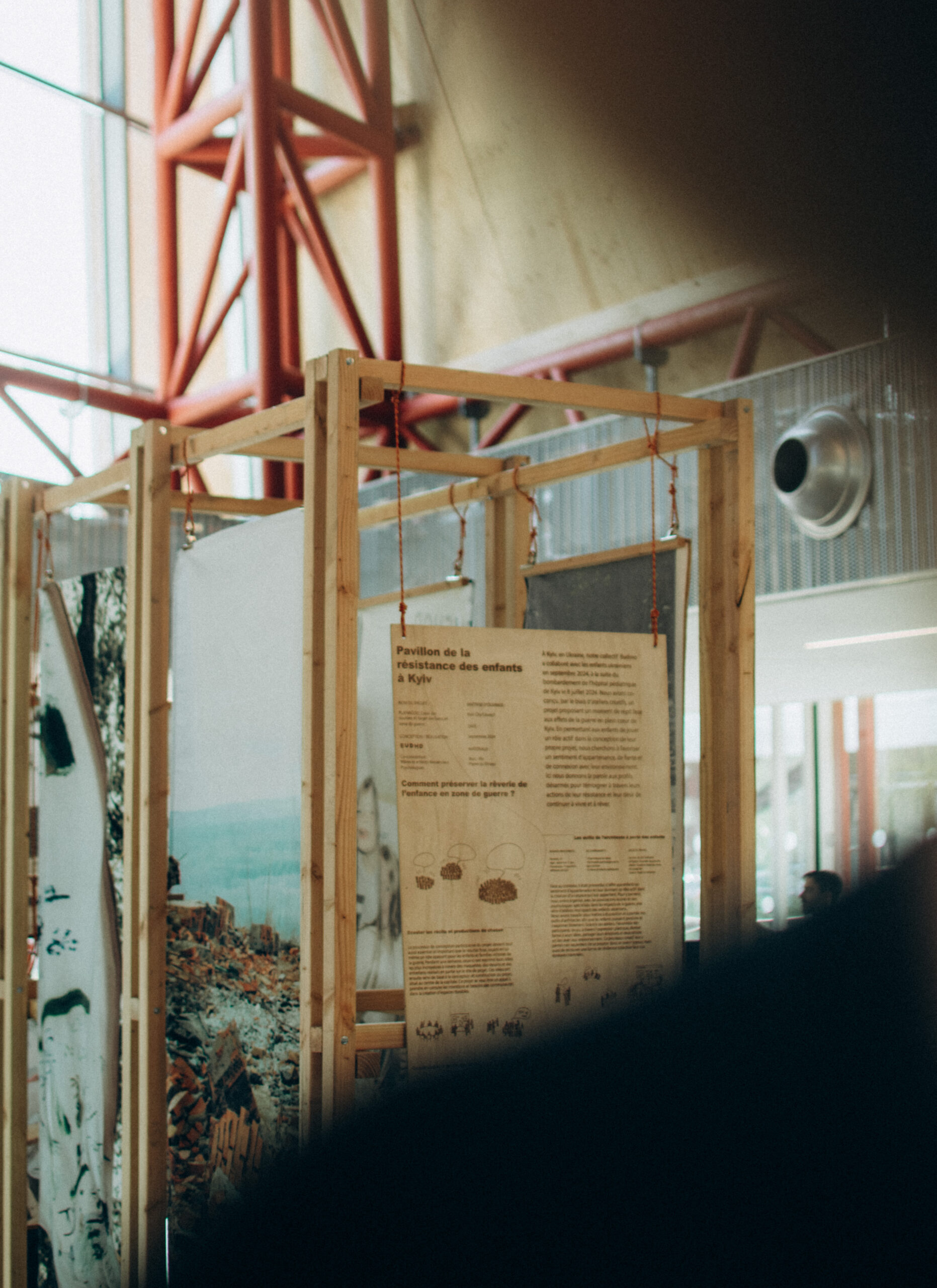 En Ukraine à Kyiv, en septembre 2024, notre collectif BUDMO a coordonné un projet avec les enfants après le bombardement de l’hôpital pédiatrique deux mois plus tôt. L’initiative visait à soutenir les enfants et leurs familles, et de construire avec eux le projet qu’ils imaginaient : le pavillon de la résistance des enfants. À travers différents ateliers et la conception puis construction du projet à partir des ressources locales , nous avons animé de la joie et un répit face aux effets de la guerre.