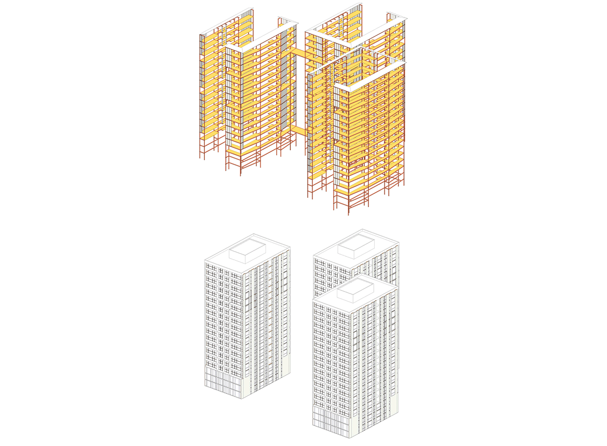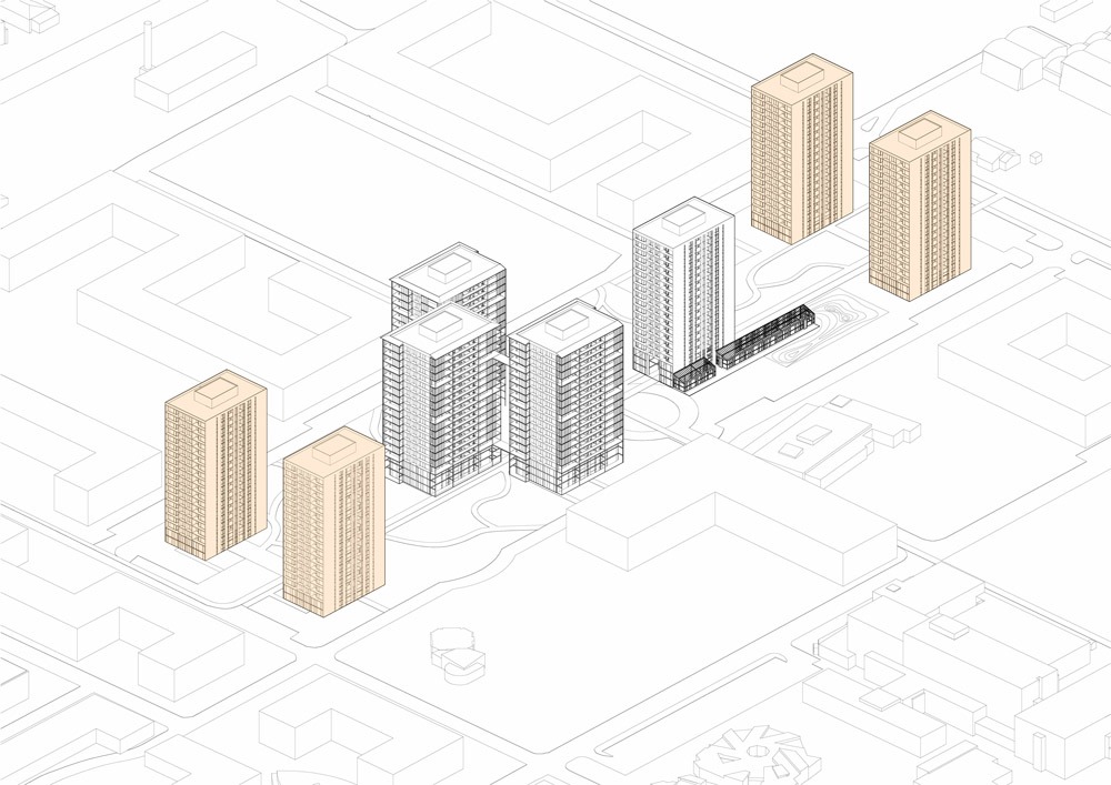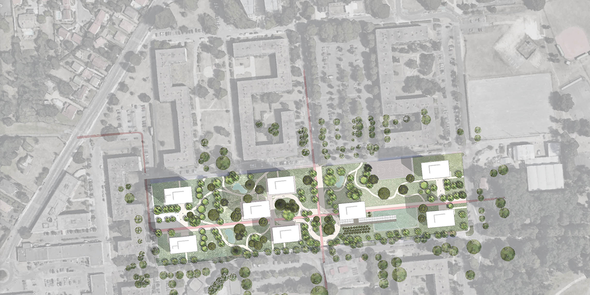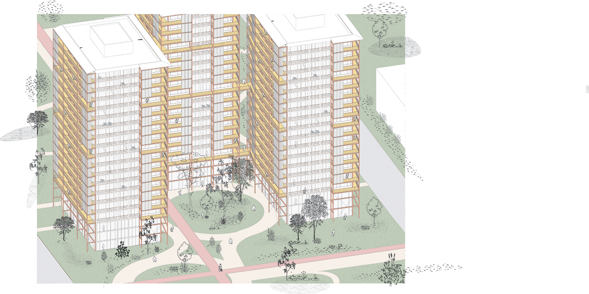 Nous avons voulu accentuer et préserver la faible densité bâtie en ne construisant que très peu au sol et en se concentrant sur la régénération des tours de Saige déjà présentes, afin de redonner une qualité d’habiter à ces architectures. De cette manière, le sol pourra être préservé et ainsi participer activement au corridor écologique entre Talence et Pessac.