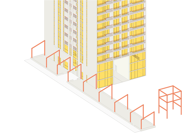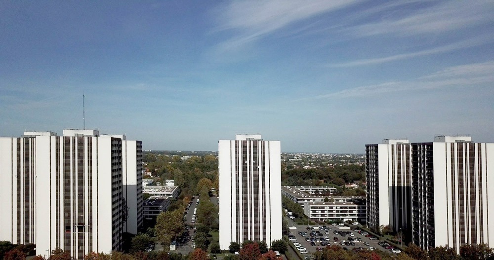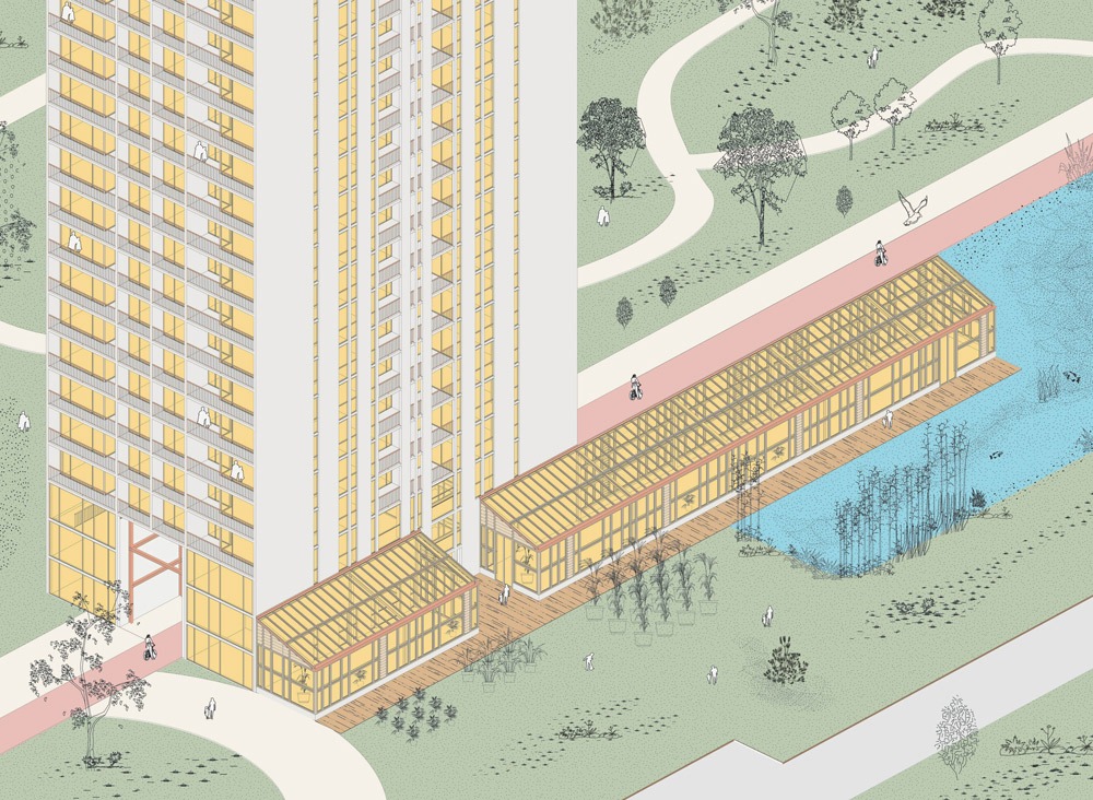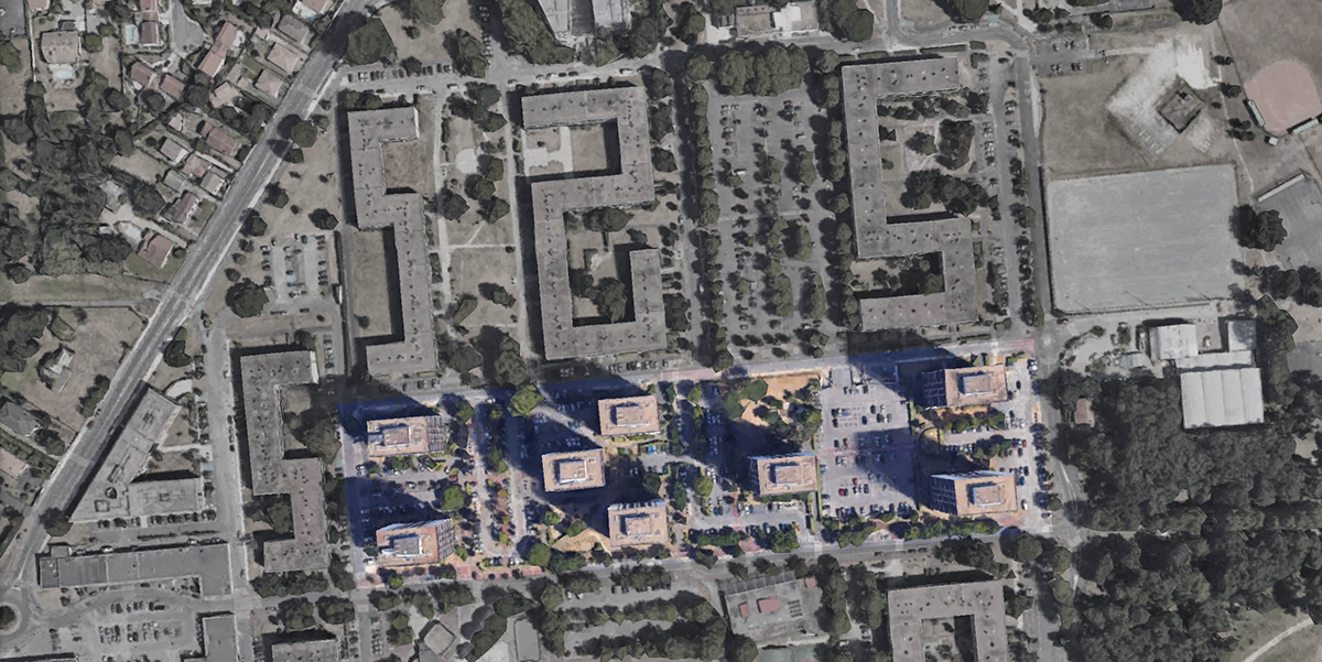 La majeure partie de l’espace public a été artificialisé au profit de la voiture et des espaces de stationnement. Le développement de réelles formes de végétation se retrouvent alors bloqué. Les phénomènes d’îlot de chaleur se retrouvent autour des 8 tours dessinées par l’architecte Dubuisson en 1974. Notre idée à travers ce projet à donc été de repenser cet héritage de l’architecture moderne dans son rapport à la nature vers une coévolution avec le vivant.